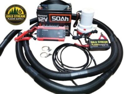 Pump Power Package. Comes with everything you need to power a small highbanker. 2000 GPH pump, Lithium battery that should give you about 4 1/2 hours run time and a charger. A speed control to adjust water flow and extend battery run time. 12 feet of hose, 12 feet of marine grade wire and 2 hose clamps. A very lightweight setup, easy to carry, just add a highbanker !